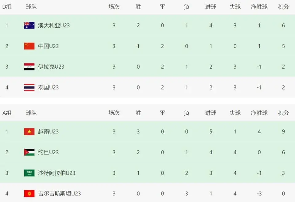 对阵泰国的比赛,国足只要保持不败就能顺利出线,最终国足也是凭借坚强的意志,有惊无险的将比分定格在0:0!整个小组赛,国足1胜2平3场0失球,以小组第二的身份强势晋级八强,创造了U23男足历史。